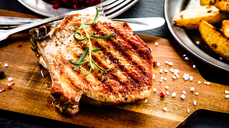 Are there pork steaks? Sure, but we generally call them chops. If you've noticed how pork chops and ribeyes look somewhat similar, keen eye; they are somewhat analogous, anatomically speaking. Filet mignon, cut from the beef tenderloin, isn't that different from a pork tenderloin filet. For the pork portion of the surf and turf, you'll likely want a classic cut, like the pork chop. But as surf and turf is all about the presentation, go big. Treat yourself to a thick-cut chop that can stand up to a high-heat sear and remain a little pink and tender inside.