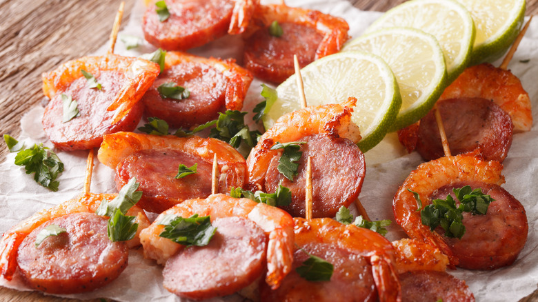 Steak and lobster — too long have you been the go-to team when it comes to the "surf and turf," the classic steakhouse combination of land-based and ocean-based proteins. There's nothing wrong with either of you. Steak, you are indeed intensely flavored, and lobster, you are lightly sweet and yielding, but your ubiquity obscures other possible pairings. Take, for instance, a classic land and sea combo that is already a beloved pairing in cuisines around the world: pork and shrimp. Neither garner the accolades that lobster and beef do when cooked in concert, but that's a darn shame.