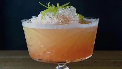 Their rendition is rather simple, containing egg white, simple syrup, freshly squeezed lemon and orange juice, Champagne, and, of course, rum. Everything other than the bubbles is shaken without ice to dissolve the egg white. The mixture is then shaken with some ice to keep it chilled, strained over a cup of shaved ice, and topped with a Champagne float. The result is a stunning rum-infused shaved ice, standing tall in stemware. If rum and bubbles don't seem to cut it, some recipes call for white wine as well.