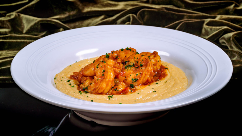 The shrimp and grits (plus chunks of andouille) we enjoyed a couple of years back during the Festival of Holidays set the bar high as far as what the Disneyland culinary team is capable of doing with the tried and true combo. Unfortunately, the Tiana's Palace rendition fell short of that. The grits, velvety and luscious, held their own. "Slow cook. Slow cook. Slow cook." That's how State described the secret to their success. Cream and chicken broth are invited to the boil, while butter and cheddar cheese come in clutch for the finish.