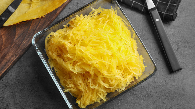Spaghetti squash, the versatile vegetable known for its stringy-like texture, has taken the culinary world by storm as a unique alternative to traditional pasta. Although the cooking process seems extremely simple — just cut and pop into the oven — oftentimes, cooks end up with a lackluster dish that's either too watery or unevenly cooked. But here's the thing, while many are familiar with the process of roasting spaghetti squash, a small yet crucial detail often goes unnoticed. Believe it or not, the orientation of your cuts can greatly impact the final outcome of your dish.