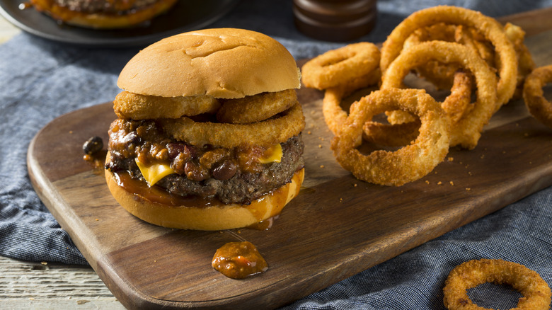 Once you've selected your perfect onion-flavored crunchy snack, it couldn't be easier to add them to your burger. Simply place a few on top of your patty and any other toppings like cheese, tomato, or lettuce, as the final step before you add the top bun. If you're more of a slider fan, you can mimic the same process, although you'll likely only need a Funyun or two for each one. Either way, your meal will turn out with added crispiness, depth, and flavor.