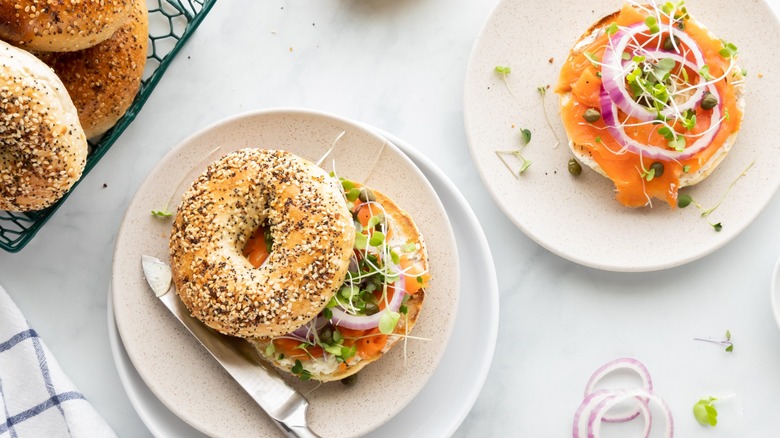 To make a salmon-lox-worthy air fryer bagel, start by preheating your air fryer to between 300 and 350 degrees Fahrenheit, depending on what your specific recipe calls for. In a large bowl, mix the yogurt and self-rising flour (or your own flour mixture) together until combined. You can even add some of the seasoning you're topping the bagel with directly into the dough, to add more flavor throughout. Once the yogurt and flour are thoroughly mixed, transfer the dough to a floured surface and knead it for several minutes.