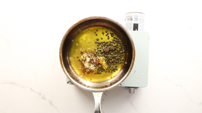 Grab a small pan and pour in the remaining olive oil. Toss in the capers for a nice salty kick, anchovies for some savory goodness, garlic for that classic flavor, and lemon zest to brighten everything up. Turn on the heat and keep an eye on it — you're just looking for a little simmer. Once things start bubbling a tiny bit, turn off the heat. You don't want to burn anything, especially not that garlic. Let it cool off for a bit, then stir in the parsley.