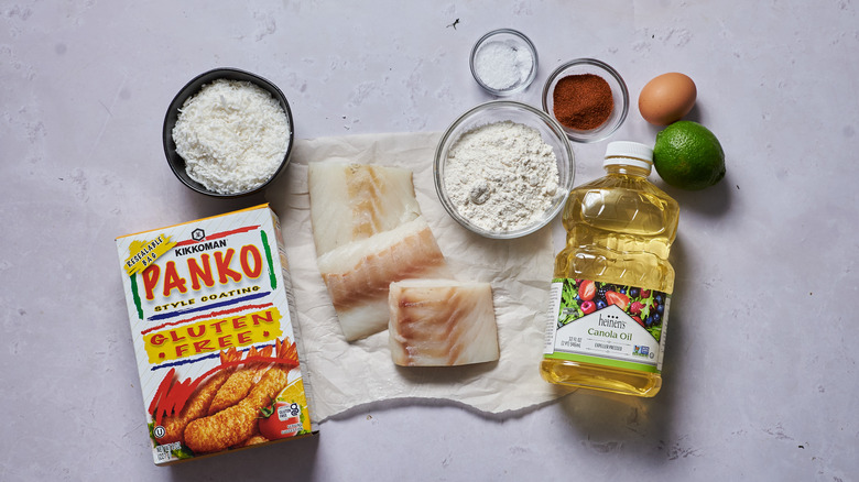 Cod is an affordable fish that is easy to cook and neutral in flavor. Because of this, it's a great candidate for breading and frying. Cod is one of the most widely accessible fish, but if you can't find it (or simply don't like it), you can swap for tilapia or use shrimp instead. From there, you'll want to grab some salt, lime, and cayenne — if you'd prefer it more mild, just use cracked black pepper. Grab some canola or vegetable oil for frying. You won't need much, just enough to fully coat the bottom of the pan. For the breading, you'll need flour, egg, panko, and shredded coconut flakes. Opt for unsweetened coconut to avoid a dessert-y fish.