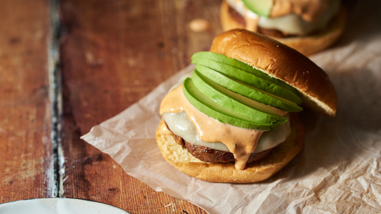 - To assemble the burgers, place the cooked patty on the bottom bun and top with 1 tablespoon of chipotle mayo. Add ¼ avocado to the burger, then add the top bun to serve.