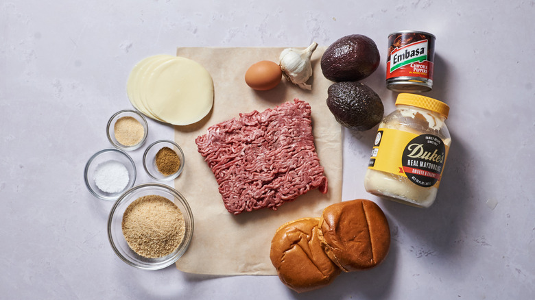 You'll also need sliced cheese — we like provolone — mayonnaise, salt, avocado, and hamburger buns. We prefer a good, sturdy brioche bun for these loaded up burgers, but any bun will do.