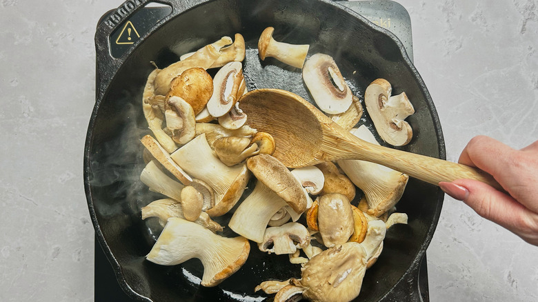 Cooking the mushrooms before the steak imparts the umami flavor into the meat. To cook the mushrooms, sauté in a cast-iron skillet over medium heat until browned and glossy. You don't need to cook them all the way through just yet, because they'll be added back into the sauce later on.