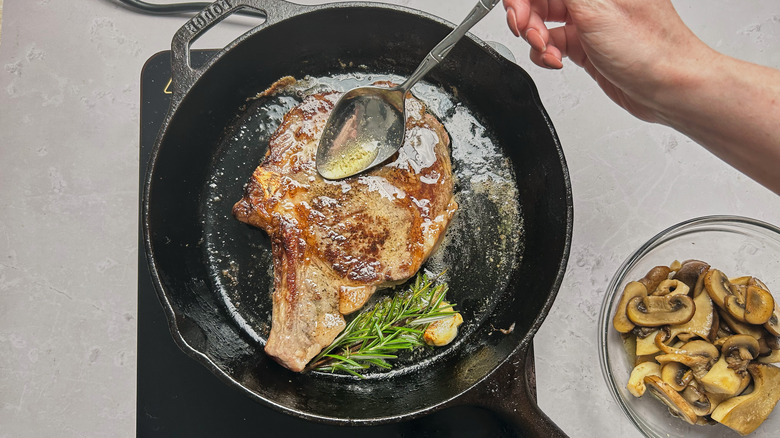 - Sear the steak until deeply browned on each side, about 6 minutes total, basting the cooked side with butter from the skillet. Once cooked, remove on a plate and cover with foil.