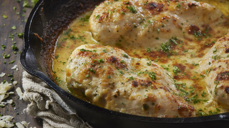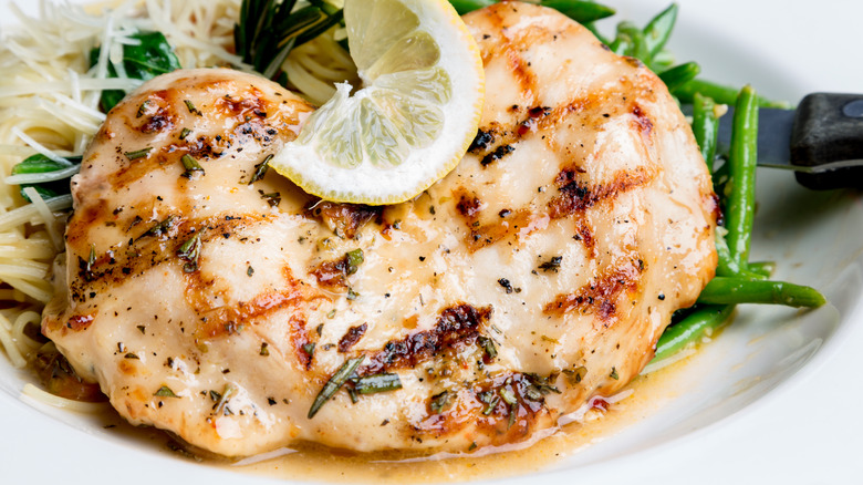 Chicken salad is on the list of the most underrated lunch fare. It's creamy, packed with protein, and perfect for spooning onto a crunchy ciabatta or sourdough. Garten makes her chicken salad Veronique with bone-in, skin-on chicken breasts rather than canned chicken or dark meat. Chicken breasts are the best part of chicken to use for chicken salad because it has a milder flavor and succulent texture — provided it's cooked correctly.