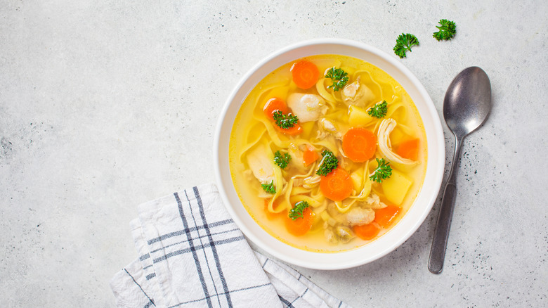 Ina Garten isn't just a master at making chicken, she's also a pro at making chicken soups. The one ingredient she uses to save chicken noodle soup from blandness is salt. Her recipe uses homemade chicken stock, pieces of roasted chicken, celery, carrots, and noodles — but she also always adds a few sizeable pinches of salt to her broth to help amp up the flavor. The salt helps amp up the umami profile of her recipe and ensures that the recipe has a well-rounded flavor.