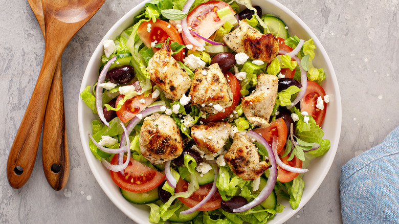 Chicken is an easy way to add extra protein to your side salad or make it into a whole meal. The type of chicken Ina Garten uses for salads is bone-in. For her chicken Waldorf salad, she always sticks to bone-in, skin-on chicken breasts. She sticks to seasoning her chicken with simple ingredients — olive oil, salt, and pepper — and bakes them in the oven. The skin helps enhance the flavors of the poultry and keeps it moist. Garten bakes the chicken at 350 degrees Fahrenheit for 35 to 40 minutes.