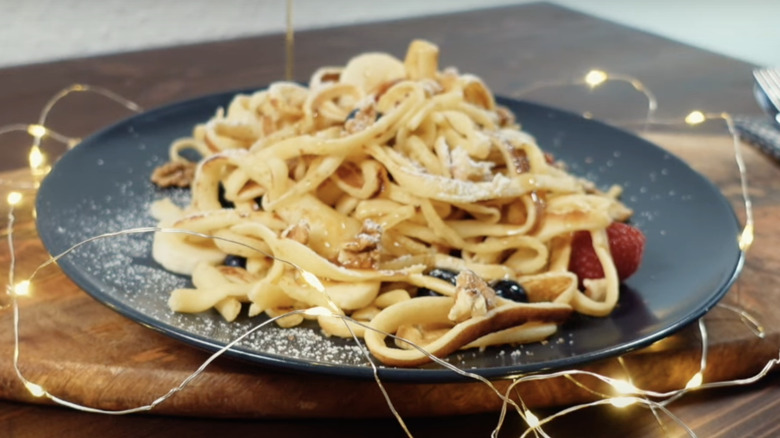Pancakes are one of the most classic breakfast foods out there — and for good reason. Besides being delicious, they're also extremely simple to make, whether you're cooking them from scratch or using a box of pancake mix. Plus, they leave plenty of room for creativity — you can add in your favorite fruit, mix in some chocolate chips, or come up with an entirely new concoction ... such as breakfast spaghetti.