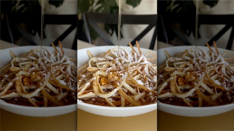 The best way to eat pancake spaghetti is in a bowl, of course, filled to the top. From there, the video suggests sprinkling some powdered sugar over the top, or you could opt for the classic pancake topping, maple syrup — or both! You can't go wrong either way, but those aren't the only options for topping.