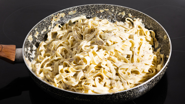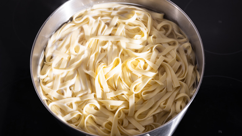 Once the cream sauce is ready, it's time to cook the pasta. Fill a large pot with water and place it on the stovetop on high heat to bring it to a boil. When the water starts to bubble, add 1 tablespoon of salt, then add the fresh tagliatelle. Follow the package instructions to cook the pasta until it's al dente, stirring occasionally to prevent it from sticking. Douglas notes that dried pasta works too, "You will just need to cook it for longer." Once the pasta is ready, drain it and reserve 1 ½ cups of pasta water for the sauce.