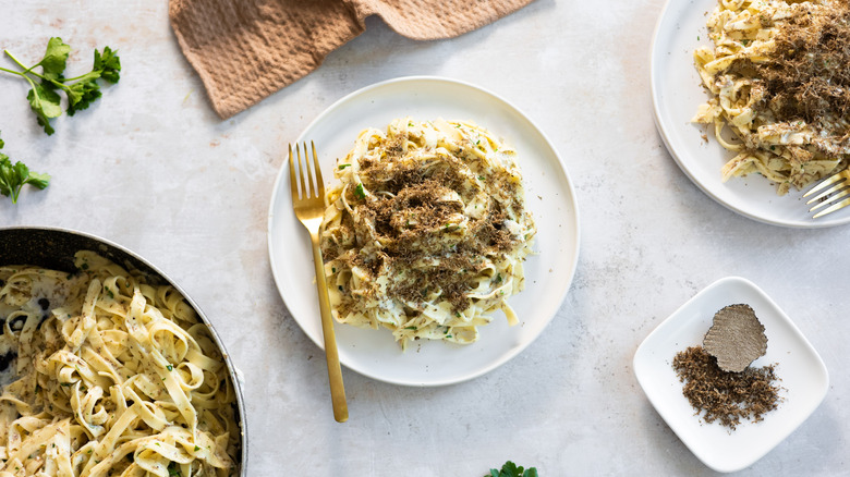 The pièce de résistance is a fresh black truffle — buy it whole and grate it. Douglas explains, "Truffle varieties are generally seasonal so firstly I would recommend researching which kind of truffles are currently available." You might need to place an order with a supplier, or she shares, "I find truffles can be sold at gourmet grocery stores and farmers markets." If you're ordering them, she recommends doing so in advance, "as availability of the truffles can vary, and you may have to allow for shipping time." Finally, truffles aren't really a shelf-stable product, and Douglas notes, "It's important to remember that truffles are best used soon after purchasing." Once you get the goods, plan to make the pasta within five days.