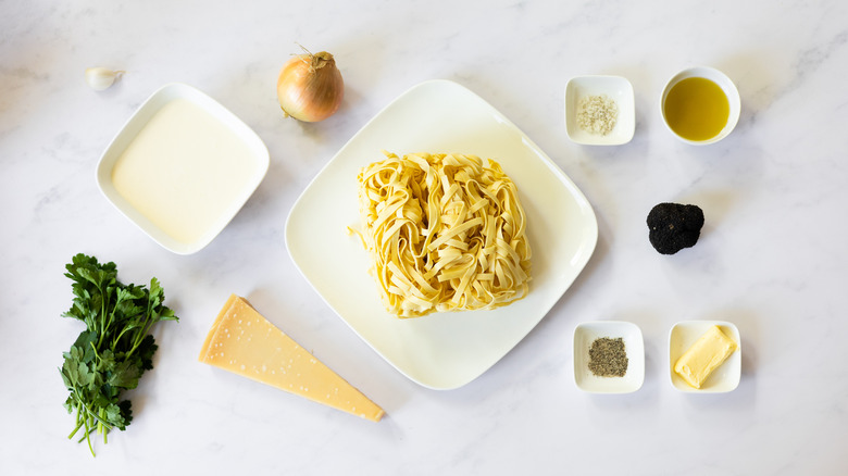 For this recipe, you'll need olive oil, a diced onion, unsalted butter, and a minced garlic clove. Next, get heavy cream, which Douglas says "allows for a beautiful, rich creamy tagliatelle that carries the flavor of the truffles." If you're unfamiliar with the taste, Douglas notes truffles are "divisive" and describes them as having a "pungent earthy, nutty, musky flavor." For this reason, she says, "Truffles are best used in dishes where [they are] not competing with any other strong flavors."