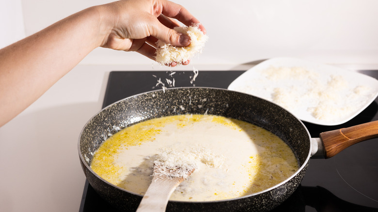 - Pour in the cream, add ⅔ of the grated truffle, grated Parmesan, ½ teaspoon of salt, and pepper, and stir well to combine with the onions and garlic.