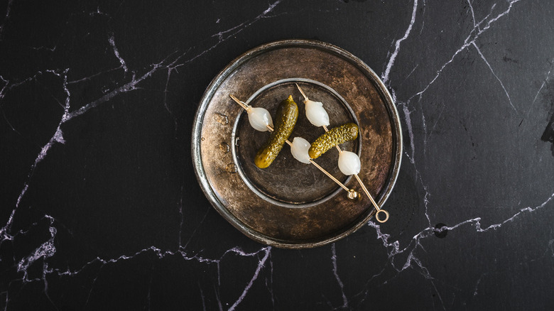 - On a cocktail spear, arrange 1 pickled onion, 1 gherkin, and another pickled onion.