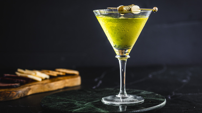 This pickle martini would be at home at any dinner party, but we love serving it for a sophisticated game night. It goes well with charcuterie or a cheese board with a selection of strong, sharp cheddars and smoked cheeses. If you're looking for other pickle-forward dishes to accompany it, we recommend a pickle juice-brined fried chicken sandwich, fried pickle spears, and creamy dill pickle hummus. It's going to be a pickle extravaganza!