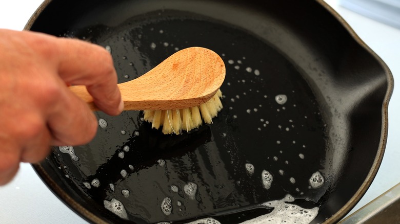 So, how do you eliminate a smell that's gotten into the pan itself? You might find a few "natural" methods online that claim to be good for your pan, but there are some cast iron cleaning methods you absolutely need to avoid. Anything involving vinegar, lemon, or soaking in water is more likely to damage your pan than anything else. If baking or salting isn't doing the trick, the best thing to do is simply scour your skillet and give it a fresh seasoning for a clean slate.