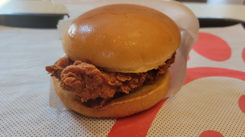 On the face of it, you would think a spicy filet would be an ideal pairing for what is essentially a spicy sandwich. However, Chick-fil-A's spicy effort doesn't quite have the hot kick we expected. Yes, it is the spiciest of the three options — but at best, its heat level is on par with fresh ground black pepper. It's better than nothing for those heat lovers, but it's definitely not something that will have you desperately reaching for your Caramel Crumble Milkshake after every bite. As with the other sandwiches, the heat you get does linger, and it retains its full spiciness until it dissipates.