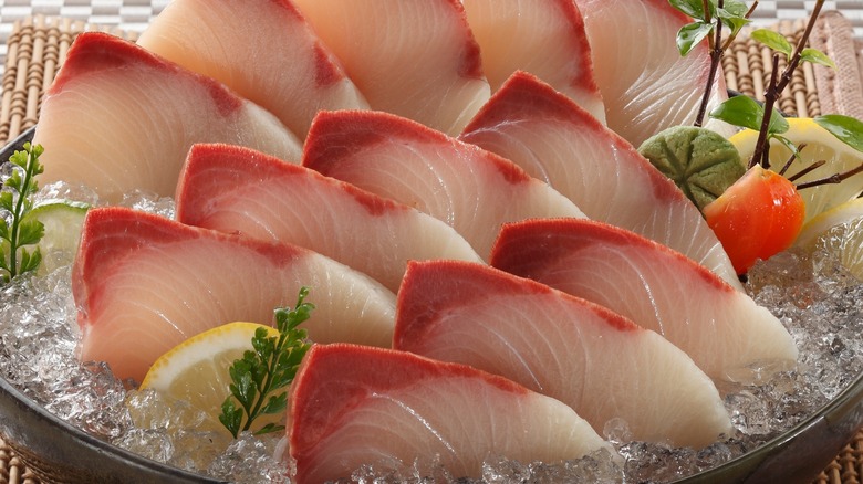 To get the best out of a raw hamachi experience, you'll need to know how to pick the fish from your preferred fishmonger. Should you buy a whole hamachi, the James Beard Rising Star Chef Award winner told us to look for clear eyes and bright red gills. Hamachi, however, doesn't usually come with its head on. In such cases, says Onwuachi, touch it. Fresh hamachi should be "slightly firm to the touch with a little give," he detailed. "I would massage it, so it would bounce and snap [up]." The chef added that "fishy aromas" and "slimy" fish scales, on the other hand, are red flags to be avoided.