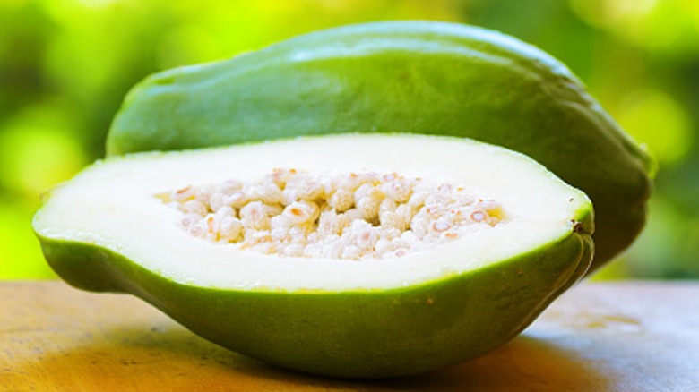After purchasing a beautiful piece of meat from your local butcher, eager to create a sumptuous feast, one of the biggest letdowns would be serving up a tough cooked steak. It's a chore to eat it and the flavor just doesn't come through as it should. That's why tenderizing beef before cooking is so important, especially for chewier varieties. That's where papaya comes in — this tropical fruit can transform any tough cut of meat into a melt-in-your-mouth masterpiece. The tenderizing power of papaya lies in an enzyme it carries called papain.