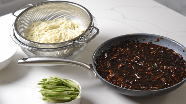 Hoffman notes that jajangmyeon can be made with any combination of vegetables you have on hand, suggesting cabbage, corn, peas, and potatoes as possible alternates to any of the ones she's using here. In her opinion, though, "Onion is a non-negotiable ingredient [because it is] essential for sweetness." She also admits that her jajangmyeon recipe "isn't spicy at all," but says that if you want a bit more kick to it, you can sprinkle it with gochugaru before digging in.