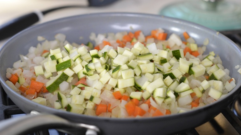 - Chop the carrot, zucchini, daikon, and onion into ¼ inch cubes.