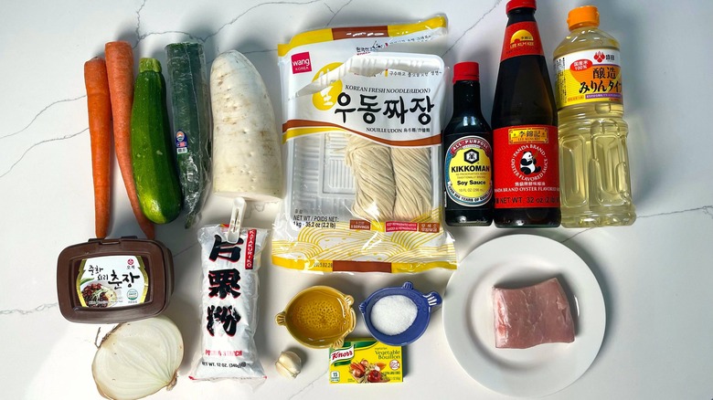 In addition to the noodles, you'll need carrots, zucchini, daikon or Korean radish, onions, garlic, pork loin or belly, mirin, cooking oil, chunjang (Korean black bean paste), sugar, soy sauce, oyster sauce, vegetable broth or bouillon, and potato starch or cornstarch for the sauce. You're also going to need a cucumber to garnish the finished dish.