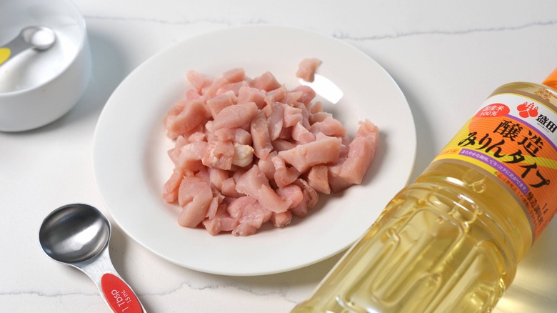 - Cut the pork into ¼ inch cubes and season it with mirin and salt.