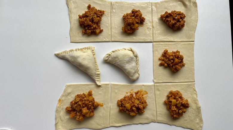 - Pick up and fold one corner of a pastry over the filling to make a triangle, and use a fork to crimp the edges sealed. Repeat with the remaining pastries.
