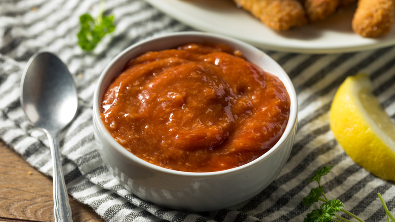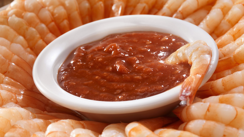 If you're unsure whether the cocktail sauce has gone bad, the first trick is to look for any mold or mildew on the surface. Don't see any? Try a smell test. If the cocktail sauce has a foul odor, which you'll know as soon as you sniff it, then it's time to toss it out. The final way to tell if your cocktail sauce has gone bad is if it's texture has gone watery or chunky — both are signs that the condiment is past its prime. Really, your best bet is to only make enough cocktail sauce for what you need, and eat it as soon as possible for the freshest taste.