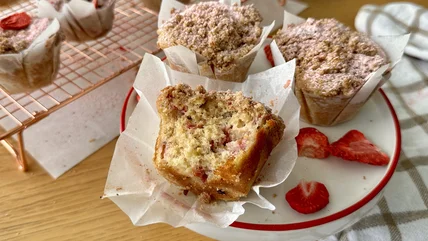 Some foods can conjure a certain feeling or memory as soon as you take that first bite. If you want something that reminds you of summer — or makes you appreciate a particularly nice summer day — look no further than the sweet combination of strawberries and rhubarb. Recipe developer Katie Rosenhouse's recipe for rhubarb muffins with sweet streusel dusted in a playful strawberry sugar transforms these two sunny fruits into a tasty treat perfect for both dessert and breakfast.