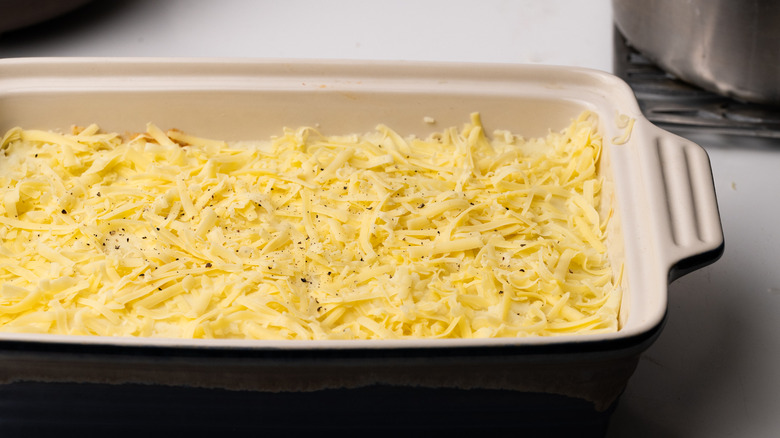 With all the constituent parts ready, it's time to assemble the pie. Using a large ovenproof dish, layer in the ingredients, starting with the ground turkey stew mixture. Then scoop the mashed potato over the meat layer, making sure that it fully covers the turkey stew below. Finally, top the whole thing off with grated cheddar cheese and bake the cottage pie until the cheesy top is starting to turn an irresistible shade of golden brown. This should take around half an hour, baking at 350 F. Once ready, serve it up hot. Rye recommends completing the English feel by pairing the pie with fresh garden peas. Delicious!