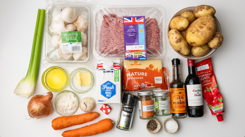 To begin this recipe for turkey cottage pie, you will need to gather the ingredients. For the meat stew, you will want some ground turkey, mushrooms, onions, carrots, celery, garlic, red wine, beef stock, Worcestershire sauce, tomato purée, flour, dried thyme, and a bay leaf. For the mash topping, you'll need potatoes, butter, milk, and some nutmeg. Lastly, you'll definitely want some mature (sharp) cheddar cheese to top off this cottage pie.