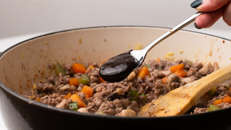 - Add the tomato purée, red wine, beef stock, Worcestershire sauce, bay leaf, dried thyme, and optionally, the marmite. Mix everything in and then let the turkey mince simmer for 45 minutes, occasionally stirring.
