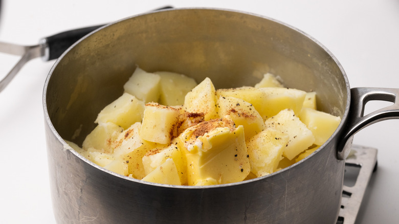 - Add the butter, milk, and nutmeg to the potatoes, along with salt and pepper, to taste, and then use a masher to mash the potatoes.