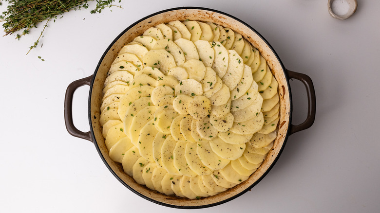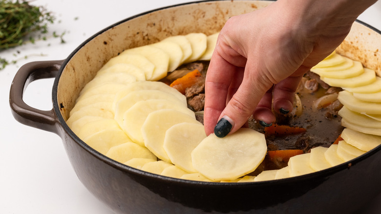 While the stew is happily simmering away, it is time to turn your attention to the potatoes. Start by peeling them, then slice them into thin discs. You can use a knife for this, although a mandolin will make the job far quicker and give you a uniformity of thickness that would make a professional chef proud. Whichever method you choose, once the potatoes are sliced it's time to layer them on top of the lamb stew in an overlapping pattern to create a "lid." There are a variety of ways to do this; some swear by adding a layer of potatoes to the bottom of the cooking pot before putting the meat on top and adding a second layer of potatoes on top, or you may choose to stick to just one layer on the top.