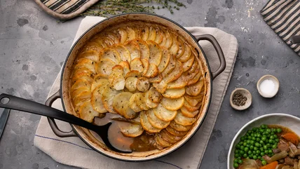 This classic recipe tenderizes even the toughest cuts of lamb, slowly cooked in a savory gravy and topped elegantly with potatoes.