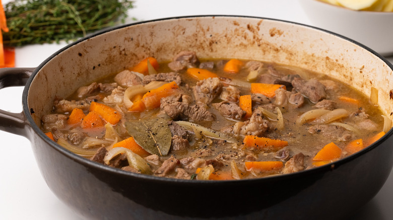 Next up, it's time to assemble the ingredients of the stew. Remove the lamb from the pan, then add in the veggies and sauté them for a few minutes. Once they take on some color, return the lamb to the pan and stir in the flour — this will serve to thicken the resulting stew. Add in the bay leaf and the fresh thyme before pouring in the stock and Worcestershire sauce. Give the ingredients in the pan a stir, then put the lid on the pan and leave the stew to simmer for roughly 20 minutes.