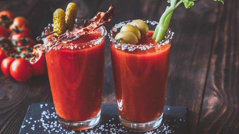 A bloody mary is the perfect accompaniment to a weekend brunch. The tomato-based vodka drink is spicy and acidic and is believed to be an excellent (albeit temporary) hangover cure. Needless to say, it secured its icon status as a brunch drink celebrity. But have you ever noticed you never see people drinking a bloody mary past brunch hours? The cocktail seems confined to a liminal pre-noon drinking spot — but for a good reason. The bloody marys you drink at brunch may taste wildly different than a bloody mary you'd get at night. This is because many establishments only use a homemade, high-quality, tomato juice mix during the day when the drink is most commonly ordered. By the time evening rolls around, some bars choose to switch to a premade drink mixer, which is often not as good as homemade ones.