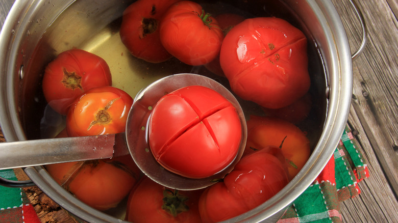 Blanching is the simplest way to remove tomato skins. Use a sharp paring knife to cut an "x" into each tomato's bottom end, then lower them into boiling water for about 30 seconds. Remove the tomatoes with a slotted spoon and immediately plunge them into a bowl of ice-cold water. The extreme change in temperature loosens the skins, allowing them to slip off easily when peeled, starting at the "x." Sure, blanching tomatoes is a tedious step when making gazpacho, but it's worth doing to ensure your soup is uniformly smooth with no acerbic notes.