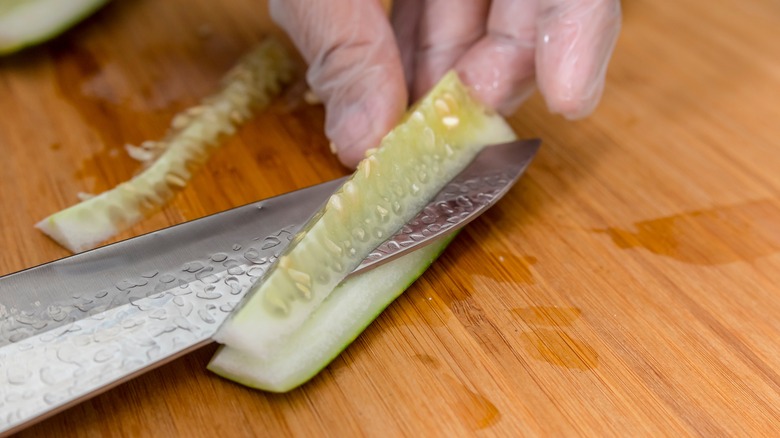 To peel or not to peel? We say peel, and here's why. Removing the skins from your tomatoes and cucumbers will remove any chance of tiny fibrous bits floating in your gazpacho. Additionally, the skins contain naturally occurring flavonoid compounds, which can impart a bitter flavor. So before you toss those tomatoes and cucumbers into the blender, take the time to remove their skins, and it will pay dividends. It's worth noting that some varieties of cukes, like English cucumbers, have thin peels that are easy to pulverize and not as bitter as conventional cucumbers, so you can leave their skins on.