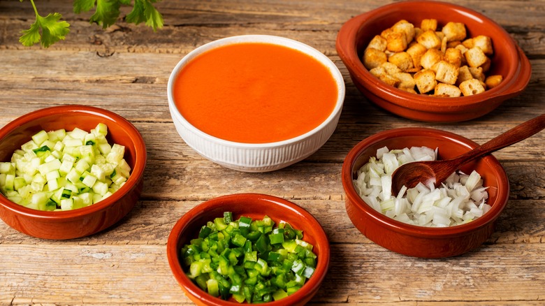 So many different foods can be used as gazpacho toppings — just be sure to finely dice the toppings into bite-sized pieces or smaller to make for easier eating and a better balance in taste. You can top your gazpacho with the same vegetables used to make the soup, like tomatoes, cucumber, peppers, onions, and croutons. But you can also veer from the recipe and opt for toppings like crème fraîche for creaminess, chopped fruits for eye appeal, toasted nuts for texture, or cold poached shrimp and Spanish cured ham for heartiness.