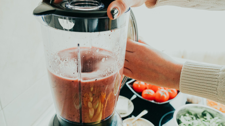 If you prefer your gazpacho on the chunkier side, you can use a food processor instead. Using the processor's pulse feature, you can retain small chunks of vegetables to add more texture. In a pinch, you could also use an immersion blender, but you'd need a deep bowl (like a bain-marie) to prevent the chance of soup splattering onto your kitchen walls. Our advice? Leave the immersion blender in the drawer and bust out the blender instead.