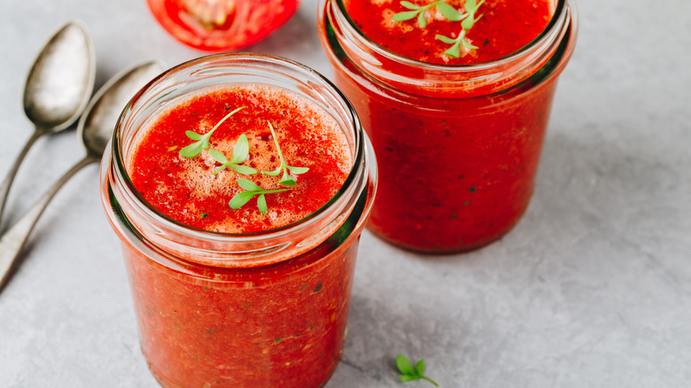 Some gazpacho recipes call for tomato juice, water, or broth because the additional liquid gives the gazpacho a soup-like consistency that can help the blender purée more efficiently. However, the pitfalls of doing this include diluting the flavor of your gazpacho and tainting the incomparable taste of fresh, in-season produce. Remember, too, that store-bought tomato juice has a distinct taste and is often made with other ingredients that will change the flavor of your gazpacho. The solution? Use the freshest, ripest produce available instead of relying on liquids like tomato juice and water. If you use in-season tomatoes, cucumbers, bell peppers, and onions, you should not need to add liquid to your gazpacho — aside from the sherry vinegar and olive oil.