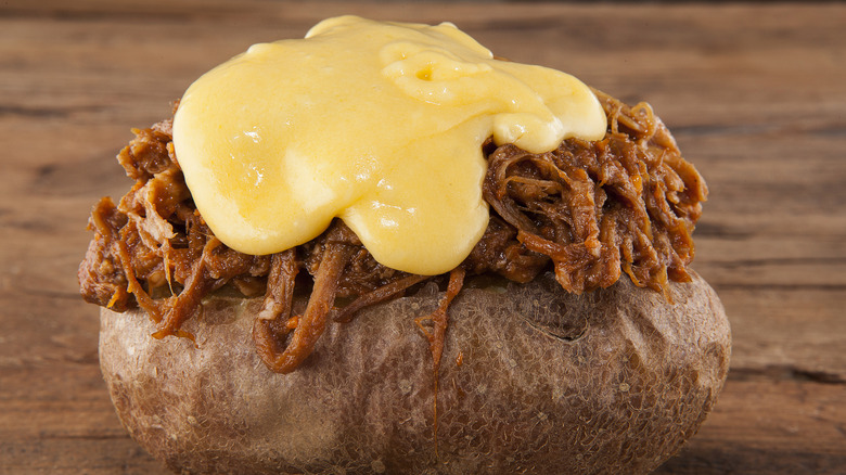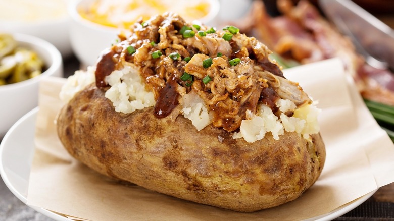 To enjoy this simple duo using leftover shredded pork, first, bake a potato in the oven (or microwave, if you're short on time). Next, reheat the pulled pork in the oven or on the stovetop on low heat. Slather the pork in your favorite barbeque sauce, taking care to stir frequently to avoid burning the sugary sauce. Once your potato is cooked through, carefully slice it open, peel back the skin, and mush up the soft insides using a fork. Spread the warmed pork inside of and atop the potato, and you're good to go.