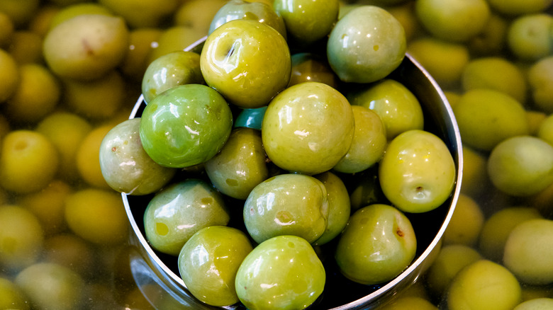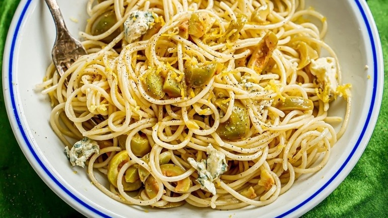 How do you like your dirty martini? Shaken with a layer of crushed ice on top, stirred until cold and smooth, or as a hot plate of pasta? If that last one throws you for a bit of a loop, then you obviously haven't seen one of the latest TikTok food trends: dirty martini pasta. This simple and satisfying dish combines gin, olive juice, lemon zest, butter, olives, garlic, and blue cheese, all tossed with spaghetti. There are obviously lots of bold flavors in the dish, so it is important to balance them so that it's not an all-out assault on your palate, especially when it comes to the olives. There are tons of varieties to choose from, but a milder green olive is the order of the day here, and Castelvetrano olives fit the bill perfectly.